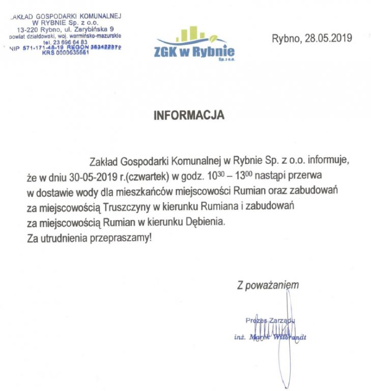 Zakład Gospodarki Komunalnej w Rybnie Sp. z o.o. informuje, że w dniu 30-05-2019 r.(czwartek) w godz. 10:30-13:00 nastąpi przerwa w dostawie wody dla mieszkańców miejscowości Rumian.