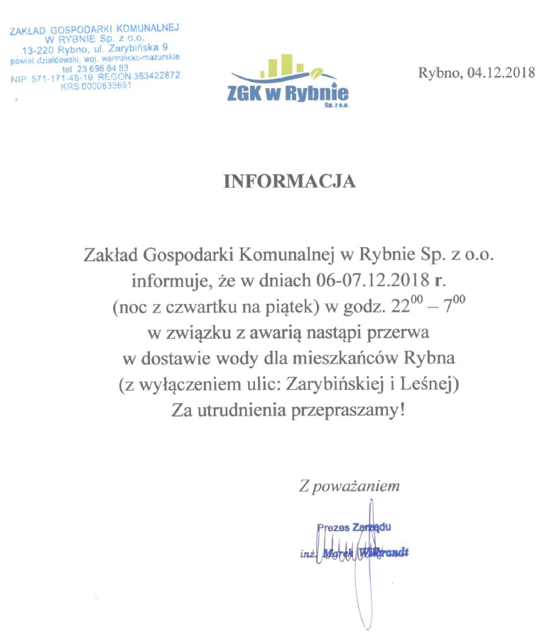 Jak informuje Zakład Gospodarki Komunalnej w Rybnie sp. z o. o. w nocy z 6 na 7 grudnia 2018r. od godziny 22:00 do godziny 7:00 nastąpi przerwa w dostawie wody dla mieszkańców miejscowości Rybno.
