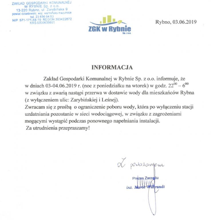 Zakład Gospodarki Komunalnej w Rybnie sp. z o. o. informuje, że w dniach 03.06-04.06.2019r. (noc z poniedziałku na wtorek) w związku z awarią nastąpi przerwa w dostawie wody.