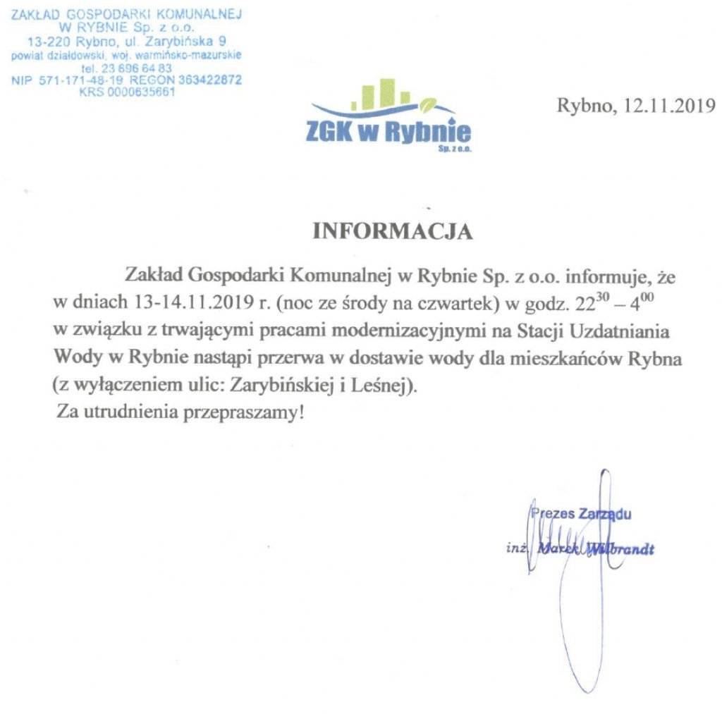 Zakład Gospodarki Komunalnej w Rybnie Sp. z o.o. informuje, że w dniach 13-14.11.2019 r. (noc ze środy na czwartek) w godz. 22:30 - 4:00 w związku z trwającymi pracami modernizacyjnymi na Stacji Uzdatniania Wody w Rybnie nastąpi przerwa w dostawie wody dla mieszkańców Rybna.