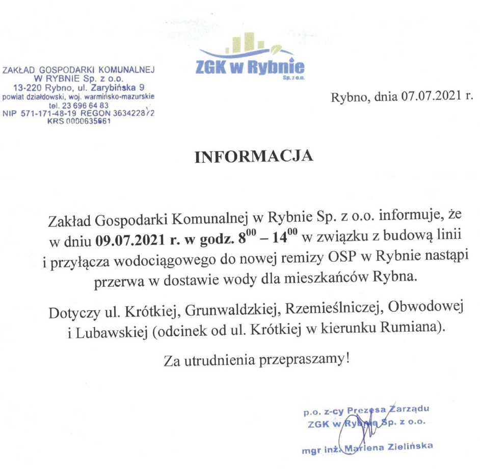 Zakład Gospodarki Komunalnej w Rybnie Sp. z o.o. informuje, że w dniu 09.07.2021 r. w godz. 8:00-14:00 w związku z budową linii i przyłącza wodociągowego do nowej remizy OSP w Rybnie nastąpi przerwa w dostawie wody dla mieszkańców Rybna.