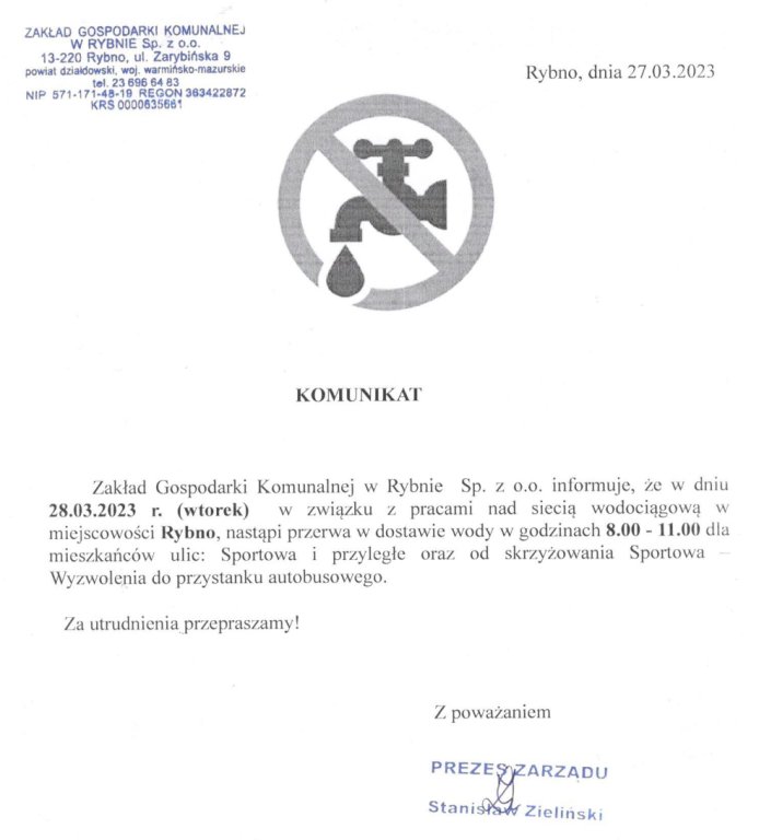 Zakład Gospodarki Komunalnej w Rybnie Sp. z o.o. informuje, że w dniu 28.03.2023 r. (wtorek) w związku z pracami nad siecią wodociągową w miejscowości Rybno, nastąpi przerwa w dostawie wody w godzinach 8.00 - 11.00 dla mieszkańców ulic: Sportowa i przyległe oraz od skrzyżowania Sportowa Wyzwolenia do przystanku autobusowego.