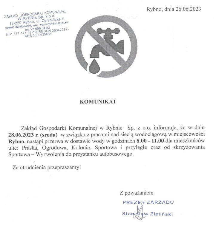 Zakład Gospodarki Komunalnej w Rybnie Sp. z o. o. informuje, że w dniu 28.06.2023 r. (środa) w związku z pracami nad siecią wodociągową w miejscowości Rybno, nastąpi przerwa w dostawie wody w godzinach 8.00 - 11.00 dla mieszkańców ulic: Praska, Ogrodowa, Kolonia, Sportowa i przyległe oraz od skrzyżowania Sportowa - Wyzwolenia do przystanku autobusowego.
