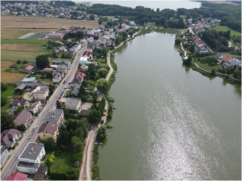 Budowa ścieżki pieszo-rowerowej z kostki betonowej została zakończona. Ostatnim elementem prac będzie instalacja oświetlenia oraz wyposażenie terenu w małą architekturę, tj.: ławki, kosze na śmieci i tablice edukacyjne. Dodatkowo na północno-zachodnim brzegu jeziora zostanie zamontowana luneta do obserwacji przyrody.