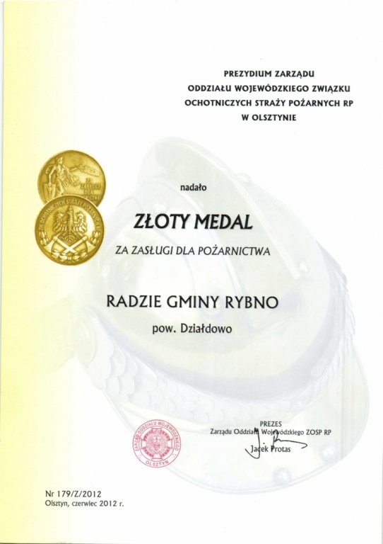 Medale zostały nadane przez Prezydium Zarządu Oddziału Wojewódzkiego Związku Ochotniczych Straży Pożarnych RP w Olsztynie. Odznaczenia zostały wręczone przez Prezesa Zarządu Oddziału Gminnego Pana Jerzego Chmielewskiego podczas XXII sesji Rady Gminy Rybno w dniu 26 czerwca 2012 r. Inicjatorem i wnioskodawcą nadania medali był Zarządu Oddziału Gminnego ZOSP RP w Rybnie, który w ten sposób chciał wyrazić podziękowanie za systematyczne wspieranie strażaków oraz za działania podejmowane zarówno przez Wójta Gminy Rybno jak i Radę Gminy Rybno na rzecz poprawy stanu ochrony przeciwpożarowej. Dzięki decyzjom Wójta i uchwałom podjętym przez Radę Gminy Rybno w ostatnich latach jednostki OSP z terenu naszej gminy wzbogaciły się o pięć fabrycznie nowych samochodów pożarniczych i dwa średnie samochody, które zostały karosowane. Zakupiono również pięć nowoczesnych motopomp oraz bardzo dużą ilość sprzętu i wyposażenia ochrony osobistej strażaka.