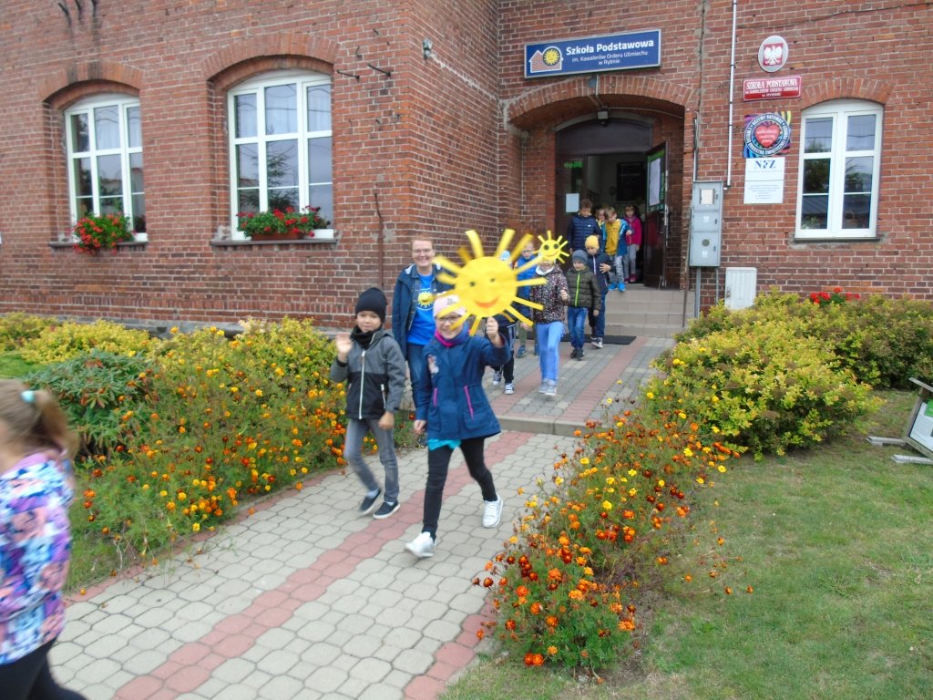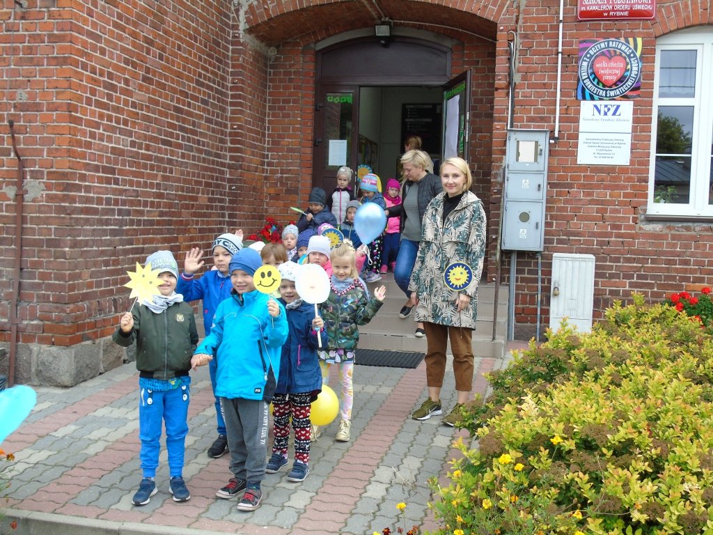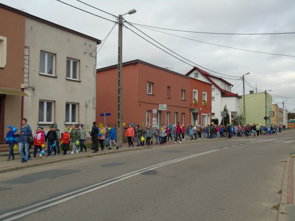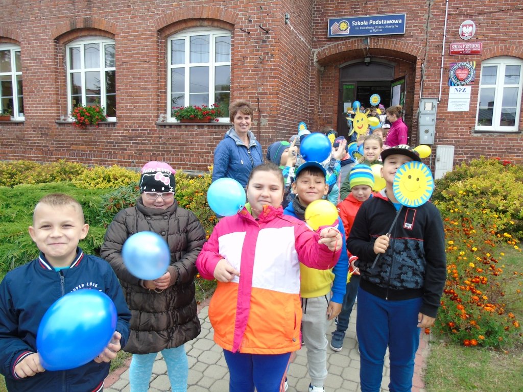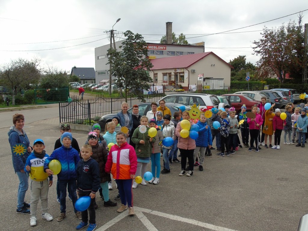 Dzieci z klas I-III i oddziałów przedszkolnych ze Szkoły Podstawowej im. Kawalerów Orderu Uśmiechu w Rybnie wyposażeni w niebieskie i żółte balony, słoneczka oraz uśmiechy, radośnie ruszyły ulicami Rybna wznosząc słoneczne okrzyki.