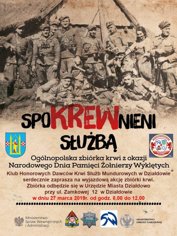 Klub Honorowych Dawców Krwi Służb Mundurowych w Działdowie serdecznie zaprasza na wyjazdowa akcję zbiórki krwi.