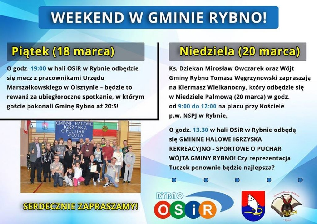 Także w niedzielę (20.03) o godz. 13.30 w hali OSiR w Rybnie odbędą się GMINNE HALOWE IGRZYSKA REKREACYJNO - SPORTOWE O PUCHAR WÓJTA GMINY RYBNO! Czy reprezentacja Tuczek ponownie będzie najlepsza?