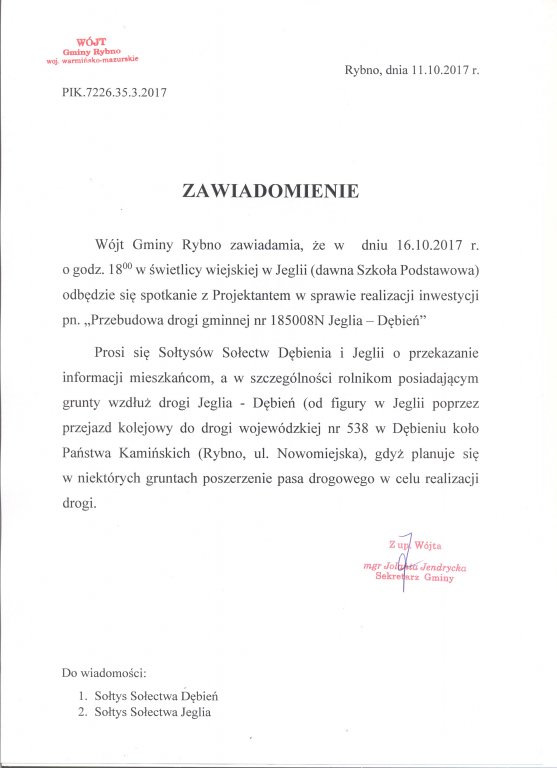 W dniu 16 października w budynku po byłej szkole podstawowej w Jeglii odbędzie się spotkanie dotyczące przebudowy drogi gminnej łączącej miejscowości Jeglia i Dębień.