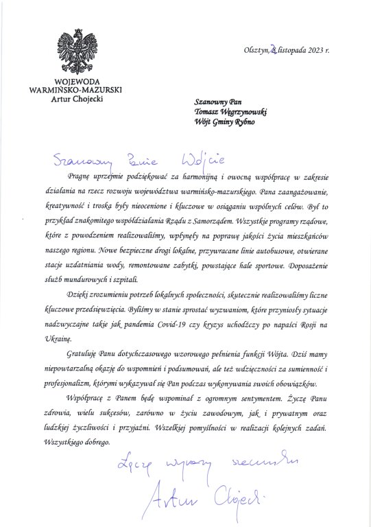 W imieniu mieszkańców Gminy Rybno pogratulowała wyboru na funkcję Posła RP i podziękowała za dotychczasową współpracę, głównie za ulokowanie Ratownictwa Medycznego i karetki pogotowia w Rybnie.