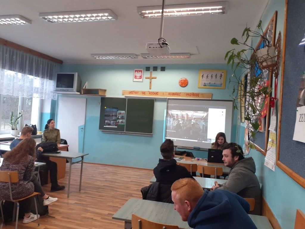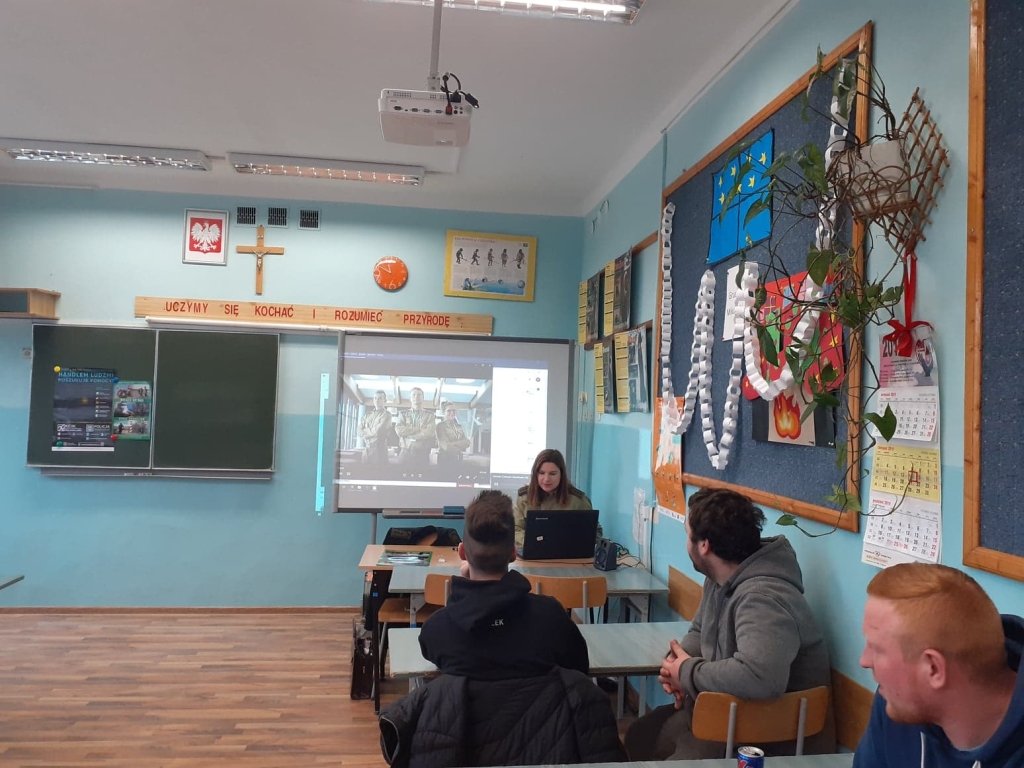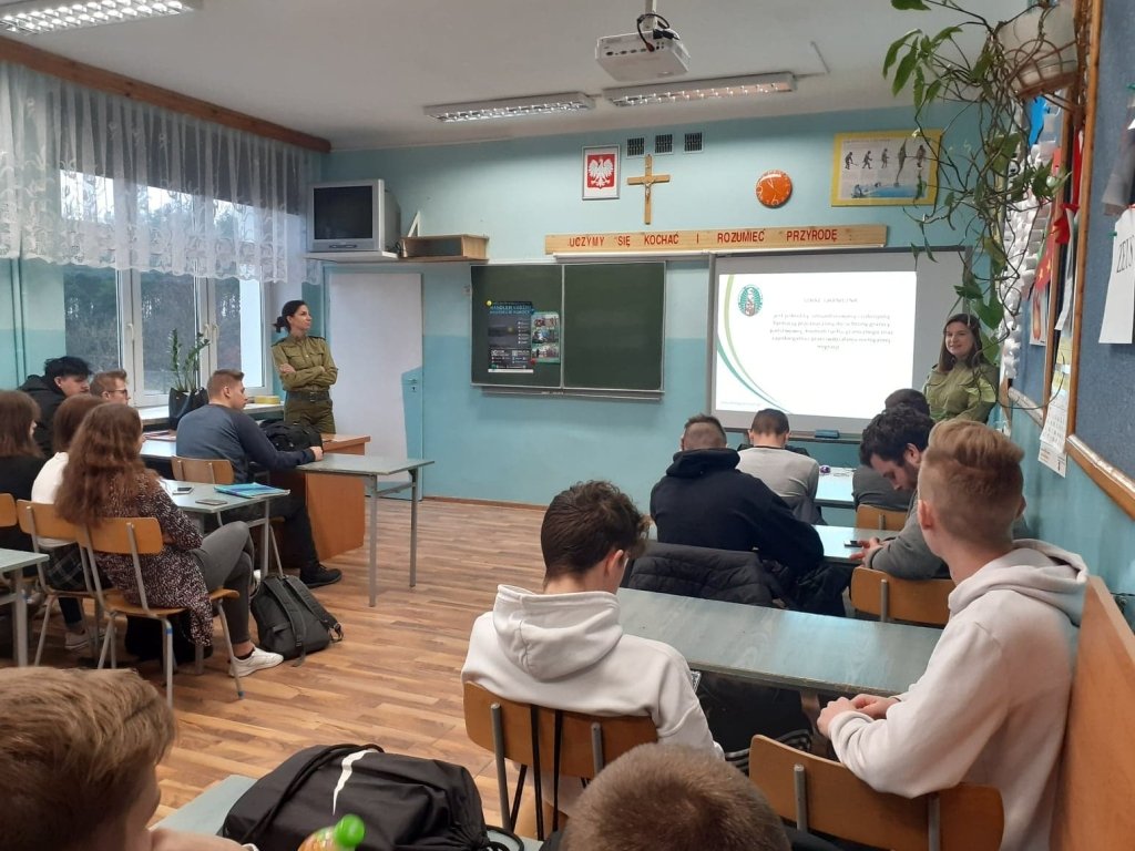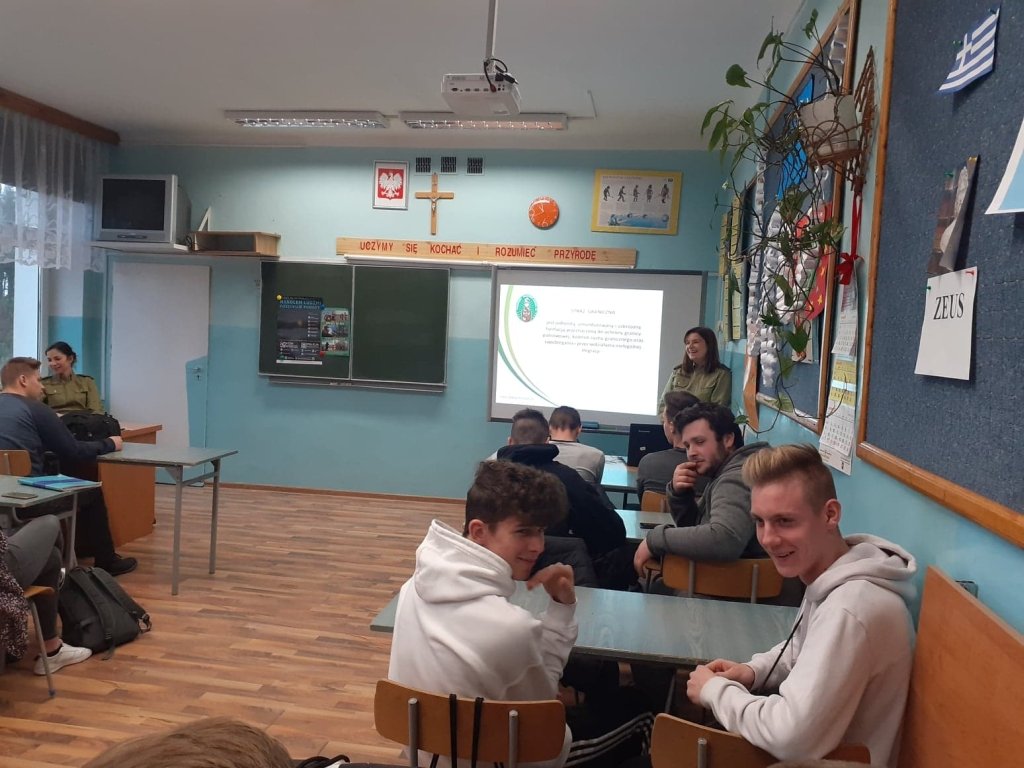 Na spotkanie z uczniami przybyły panie: ppor Agata Filipkowska oraz chor. szt. Marzena Melzacka. Funkcjonariuszki przeprowadziły zajęcia z uczniami klas II i III liceum oraz szkoły branżowej. Pierwsza część spotkania dotyczyła problematyki Handlu Ludźmi, który jest uznawany za współczesną formę niewolnictwa. Przedstawiono zagrożenia związane z kontaktami z ludźmi nieznajomymi, oferującymi pracę, łatwe zarobki i lepsze życie. Druga część spotkania poświęcona była pracy w Służbie Granicznej. Prowadzące omówiły warunki, jakie należy spełnić przy ubieganiu się o pracę w oddziale Służby Granicznej. Opowiadały o codziennych zadaniach i zaletach swojej pracy, a także o trudnościach i niebezpieczeństwach z nią związanych.
