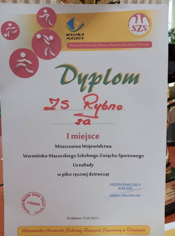 Dnia 15 czerwca odbyły się mistrzostwa województwa W-M SZS w piłce ręcznej dziewcząt. Drużyna dziewcząt Zespołu Szkół w Rybnie pokonała drużynę ZS Malinowo 7:4 i zajęły I miejsce.