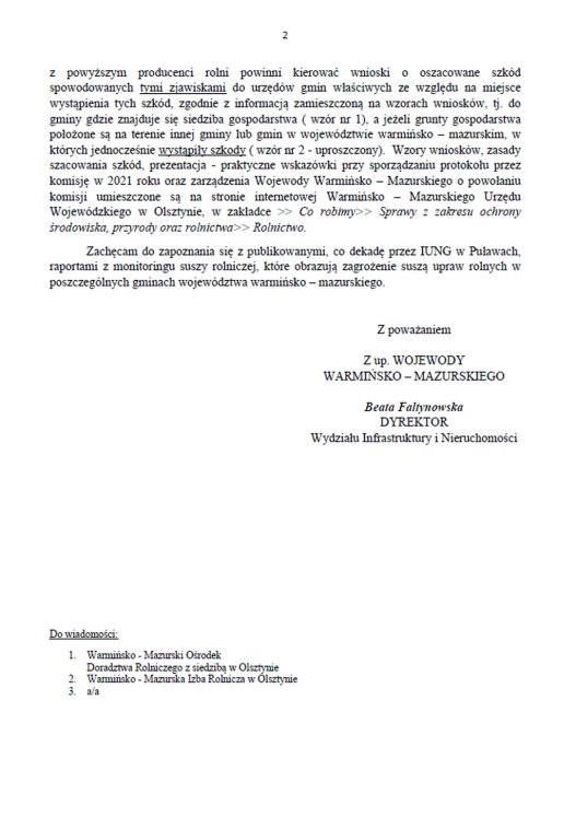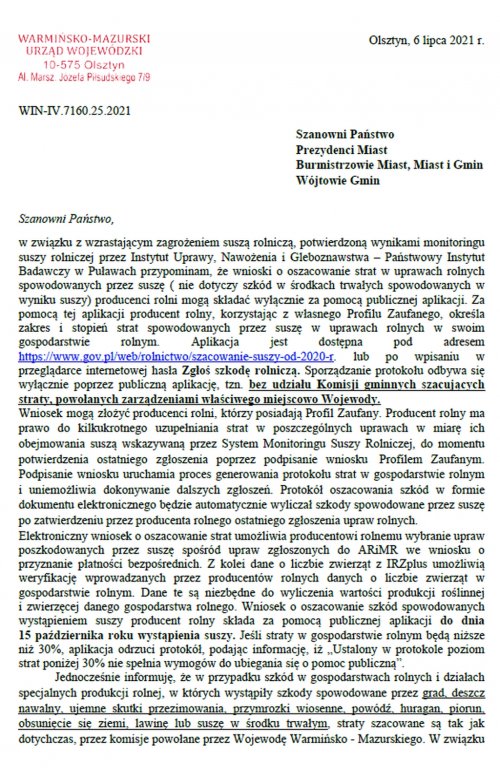 Szkody w gospodarstwie rolnym spowodowane przez grad, deszcz nawalny, ujemne skutki przezimowania, przymrozki wiosenne, powódź, huragan, piorun, obsunięcie się ziemi, lawinę lub suszę w środku trwałym, straty szacowane są jak dotychczas – przez komisje powołane przez Wojewodę Warmińsko – Mazurskiego. Wnioski o oszacowanie szkód ww. zjawiskami rolnicy powinni kierować do właściwych urzędów gmin.
