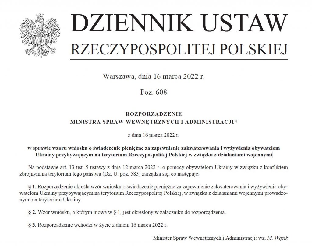 W Dzienniku Ustaw opublikowano rozporządzenie w sprawie wzoru wniosku o świadczenie pieniężne za zapewnienie zakwaterowania i wyżywienia obywatelom Ukrainy przybywającym na terytorium Rzeczypospolitej Polskiej w związku z działaniami wojennymi. Na podstawie wniosku osoby udzielające gościny uchodźcom będą mogły ubiegać się o zwrot kosztów pobytu w wysokości 40 zł dziennie za osobę. Rozporządzenie weszło w życie z dniem 16 marca.