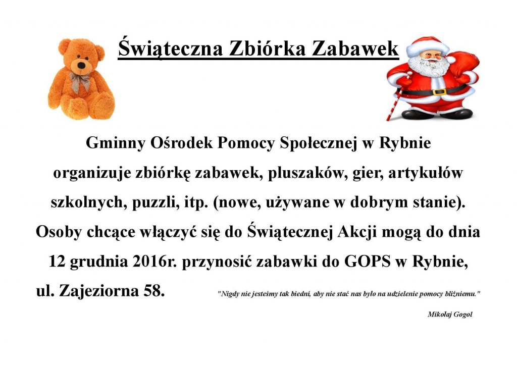 Osoby chcące włączyć się do Świątecznej Akcji mogą do dnia 12 grudnia 2016r. przynosić zabawki do GOPS w Rybnie, ul. Zajeziorna 58.