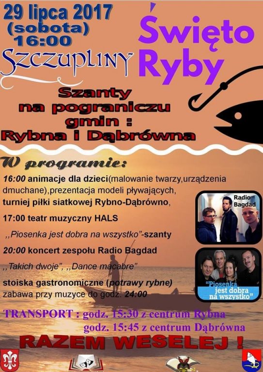 W sobotę, 29 lipca o godz. 16:00 w Szczuplinach odbędzie się Święto Ryby organizowane przez Gminę Rybno i Gminę Dąbrówno oraz Gminną Bibliotekę Publiczną w Rybnie i Gminne Centrum Kulturalno – Biblioteczne w Dąbrównie.