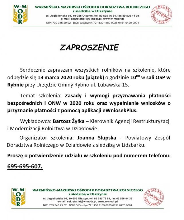Serdecznie zapraszamy wszystkich rolników na szkolenie, które odbędzie się 13 marca 2020 roku (piątek) o godzinie 10:00 w sali OSP w Rybnie przy Urzędzie Gminy Rybno ul. Lubawska 15.