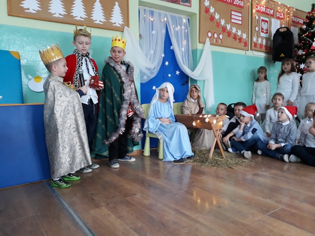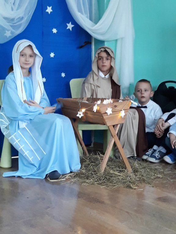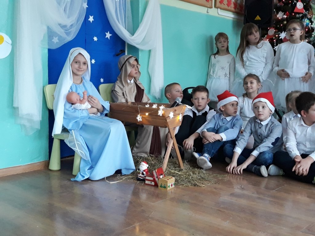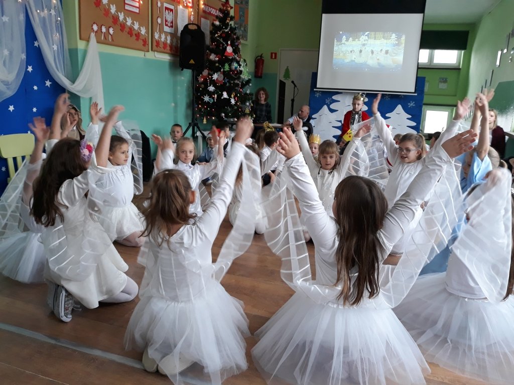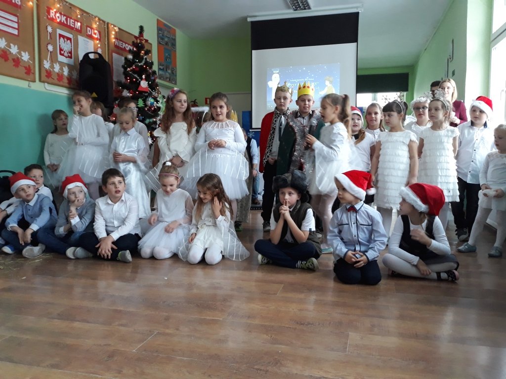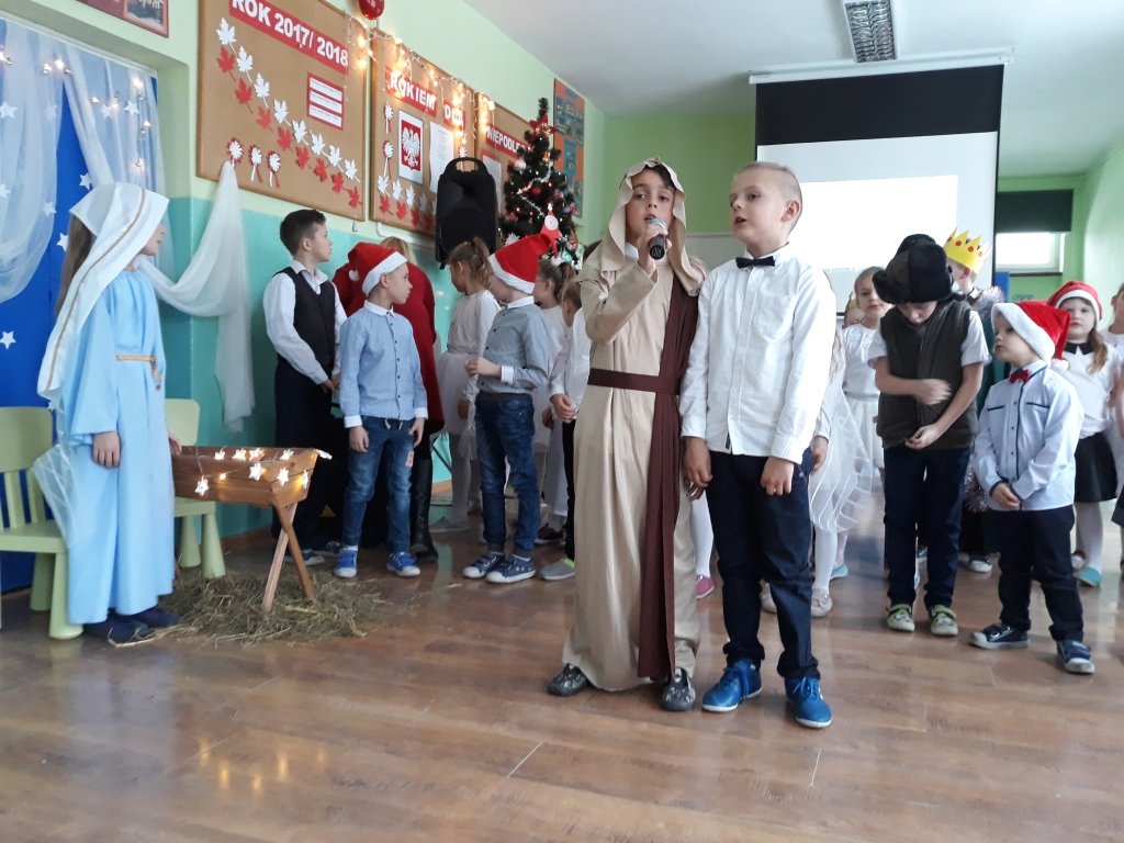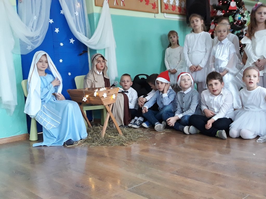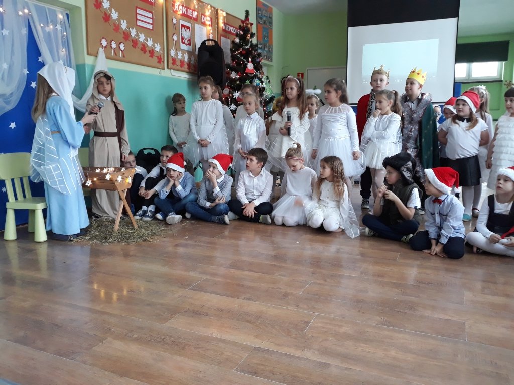 W klasach uczniowie podzielili się opłatkiem, a następnie wszyscy wraz z przybyłymi rodzicami zebrali się na korytarzu szkolnym, żeby wspólnie obejrzeć jasełkę w wykonaniu dzieci z klas I-III i oddziału przedszkolnego oraz spotkać się z wyczekiwanym gościem - Mikołajem.