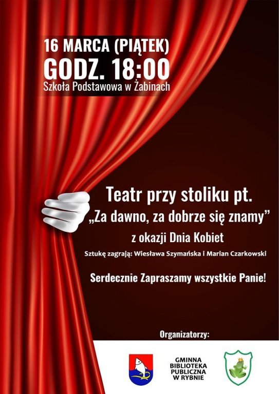 W piątek, 16 marca 2018 roku o godz. 18:00 w Szkole Podstawowej im. Polskich Mistrzów Olimpijskich w Żabinach odbędzie się spotkanie dla wszystkich Pań z cyklu – Teatr przy stoliku pt. „Za dawno, za dobrze się znamy” z okazji Dnia Kobiet.