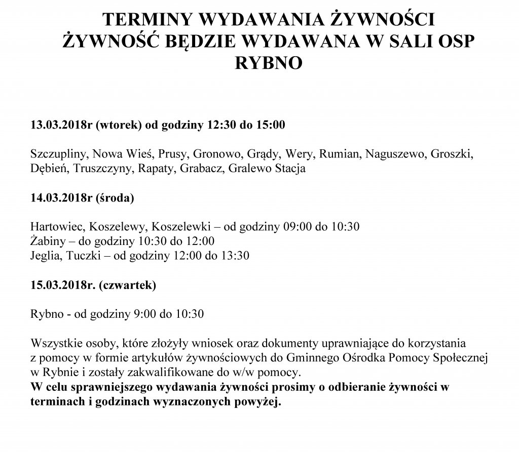 Żywność wydawana będzie w sali Ochotniczej Straży Pożarnej w Rybnie.