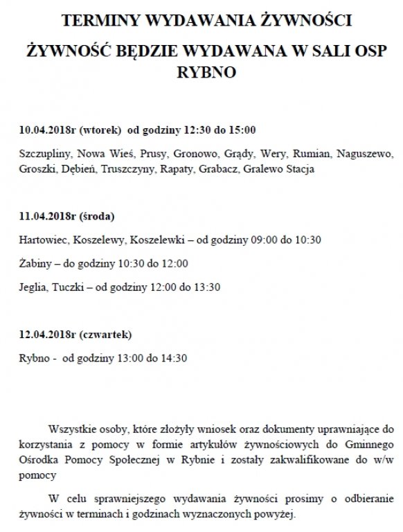 Żywność wydawana będzie w sali Ochotniczej Straży Pożarnej w Rybnie.