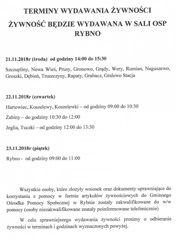 Osoby, które złożyły wniosek oraz dokumenty uprawniające do korzystania z pomocy w formie artykułów żywnościowych do Gminnego Ośrodka Pomocy Społecznej w Rybnie i zostały zakwalifikowane do w/w pomocy (osoby niezakwalifikowane zostały poinformowane telefonicznie).