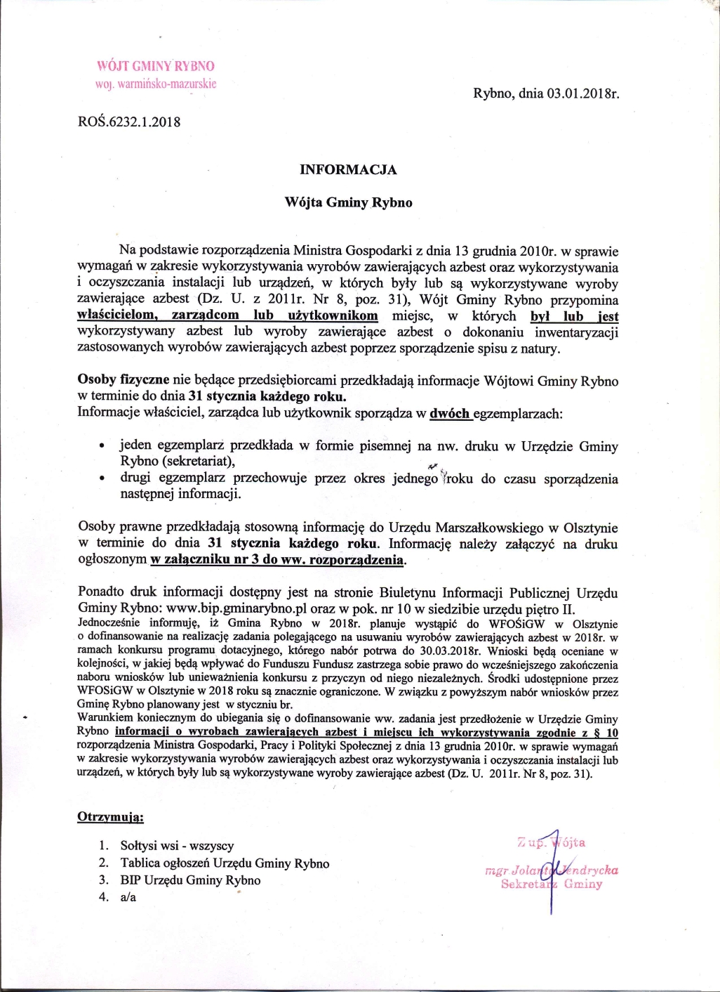 Na jej podstawie gmina Rybno wystąpiła do Regionalnej Dyrekcji Ochrony Środowiska w Olsztynie o „Zezwolenie na odstępstwa od zakazów w stosunku do gatunków dziko występujących zwierząt objętych ochroną”. Dzięki dobrze przygotowanej ekspertyzie oraz zaplanowaniu harmonogramu prac, nie kolidującemu z lęgami ptaków oraz nietoperzy, gmina Rybno uzyskała stosowne zezwolenie na prowadzenie prac w sezonie lęgowym. Oprócz pozwolenia z RDOŚ Olsztyn, nad pracami budowlanymi prowadzony jest nadzór przyrodniczy, w celu zminimalizowania negatywnego oddziaływania na ptaki oraz nietoperze. Pierwszym budynkiem, którego remont został już zakończony, a na którym widać efekty działań minimalizujących wpływ na siedliska ptaków jest budynek Urzędu Gminy. Budynek ten przed remontem zasiedlany był przez wróble oraz jaskółki oknówki. Wskutek prac termomodernizacyjnych zniszczono siedliska tych ptaków. W celu odtworzenia miejsc lęgowych zostały zamontowane budki oraz gniazda lęgowe. Są one wykonane z trocinobetonu, materiału dużo trwalszego od drewna. Ich montaż nie wpływa na właściwości termoizolacyjne budynku, a pomalowanie ich na kolor elewacji sprawia, że nie rzucają się w oczy. Miejsce oraz termin montażu budek konsultowany był z nadzorem przyrodniczym, prowadzonym przez Pana Łukasz Głowackiego. Zostało zamontowanych 8 podwójnych budek dla wróbla oraz 4 gniazda lęgowe dla jaskółki oknówki. Widoczne są już pierwsze efekty. Po ok. dwóch tygodniach od montażu budek, są one zasiedlane przez wróble, a w 1 z nich są już pisklaki. Przykład ten pokazuje, że odpowiednie zaplanowanie harmonogramu prac oraz uzyskanie stosownych pozwoleń jest możliwe i prace budowlane można wykonywać w sezonie lęgowym ptaków bez obaw o ich wstrzymanie ze względu na lęgi awifauny.