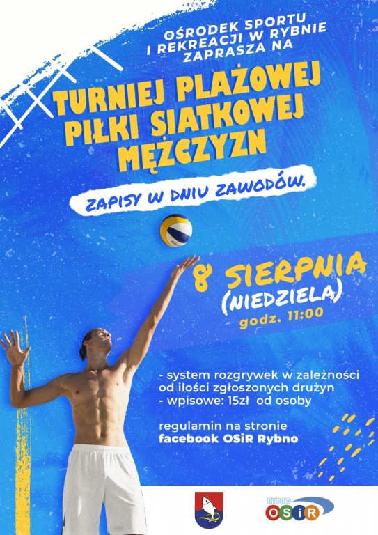 Ośrodek Sportu i Rekreacji w Rybnie zaprasza na Turniej Siatkówki Plażowej Mężczyzn.