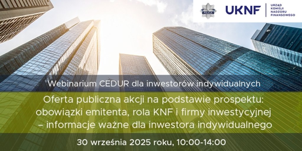 „Oferta publiczna akcji na podstawie prospektu: obowiązki emitenta, rola KNF i firmy inwestycyjnej – informacje ważne dla inwestora indywidualnego” organizowane w ramach projektu Centrum Edukacji dla Uczestników Rynku – CEDUR, we współpracy z Komendą Główną Policji.