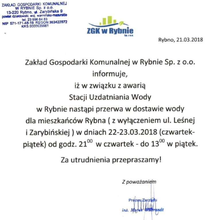 Jak informuje Zakład Gospodarki Komunalnej w Rybnie sp. z o. o. należy się spodziewać przerwy w dostawie wody dla mieszkańców Rybna.