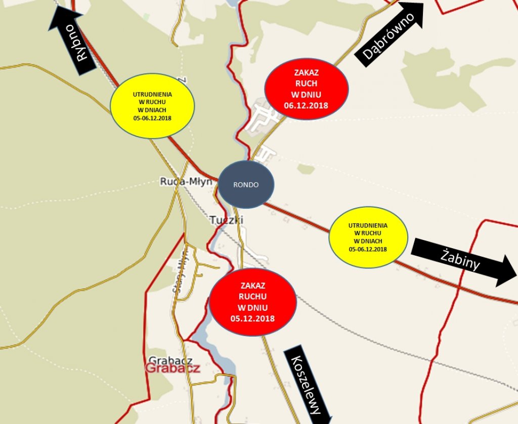 W związku z przebudową ronda w miejscowości Tuczki będą wprowadzone objazdy alternatywne w dniach 05-06.12.2018r. w godz. 8:00-16:00.