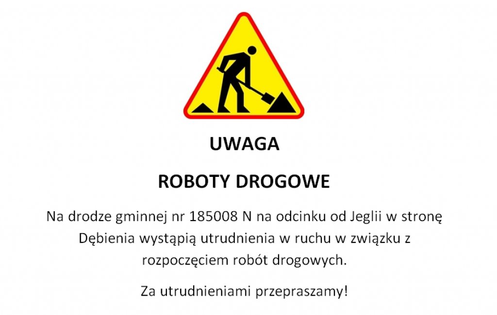 Na drodze gminnej nr 185008 N na odcinku od Jeglii w stronę Dębienia wystąpią utrudnienia w ruchu w związku z rozpoczęciem robót drogowych.