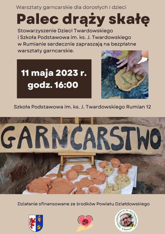 Stowarzyszenie Dzieci Twardowskiego i Szkoła Podstawowa im. ks. Jana Twardowskiego w Rumianie zapraszają na bezpłatne warszaty garncarskie.