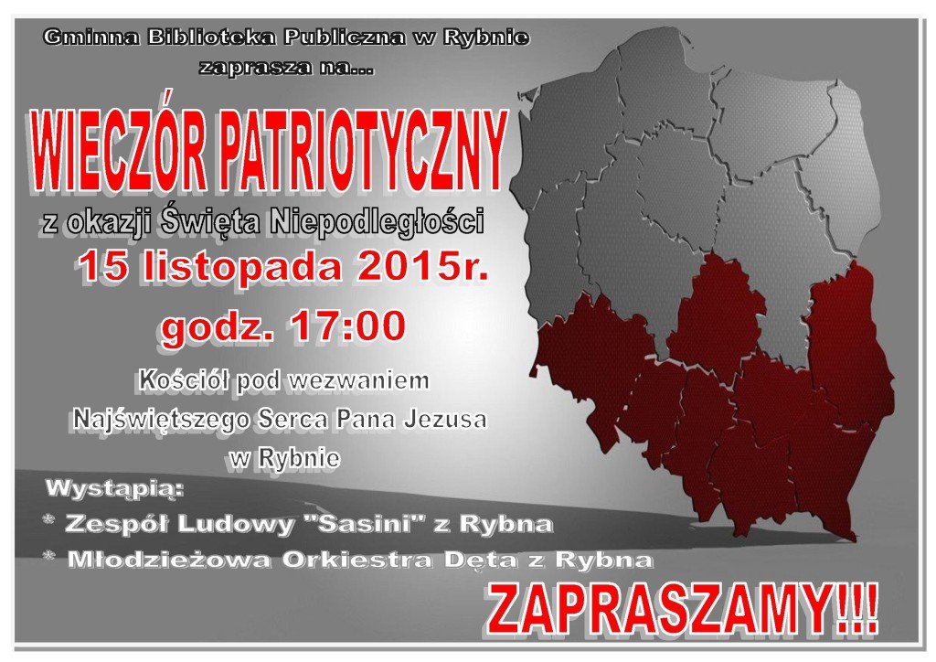 Uroczystość rozpocznie się w niedzielę, 15 listopada 2015 r. o godzinie 17:00 w kościele parafialnym pw. Najświętszego Serca Pana Jezusa w Rybnie. Podczas "Wieczoru Patriotycznego" wsytąpi Młodzieżowa Orkiestra Dęta oraz zespół ludowy "Sasini" z Rybna.
