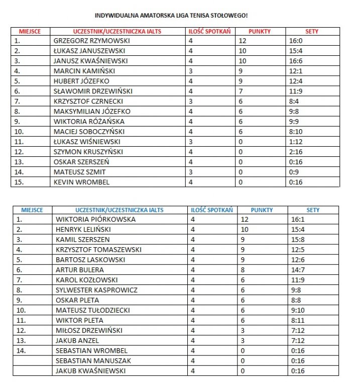 W niedzielę, 17 stycznia o godz. 13:00 w hali Ośrodka Sportu i Rekreacji w Rybnie odbyła się pierwsza runda Indywidualnej Amatorskiej Ligi Tenisa Stołowego. Udział w zawodach bierze 31 zawodników, którzy w pierwszej rundzie rozegrali cztery kolejki.