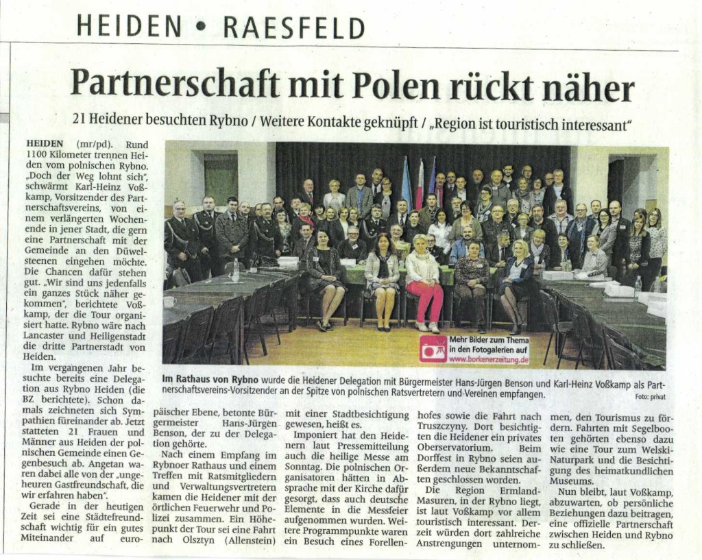 W niemieckiej geazecie "Borkener Zeitung" opublikowany został artykuł dotyczący wizyty gości z Gminy Heiden w Gminie Rybno.