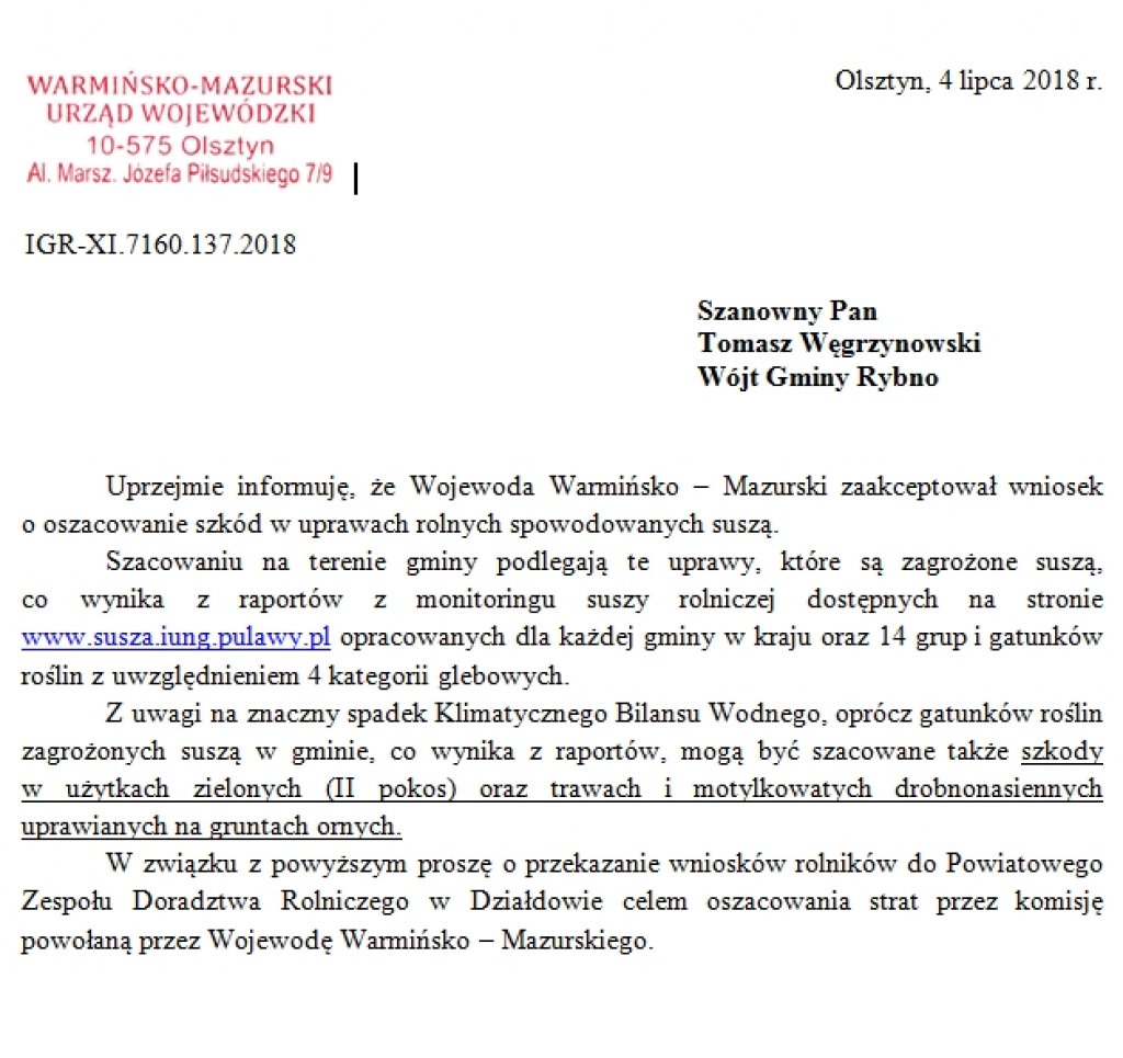 Wojewoda Warmińsko – Mazurski zaakceptował wniosek Gminy Rybno o oszacowanie szkód w uprawach rolnych spowodowanych suszą.