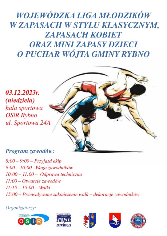 Komunikat organizacyjny Wojewódzkiej Ligi Młodzików w zapasach w stylu klasycznym, zapasach kobiet oraz mini zapasy dzieci o Puchar wójta Gminy Rybno.