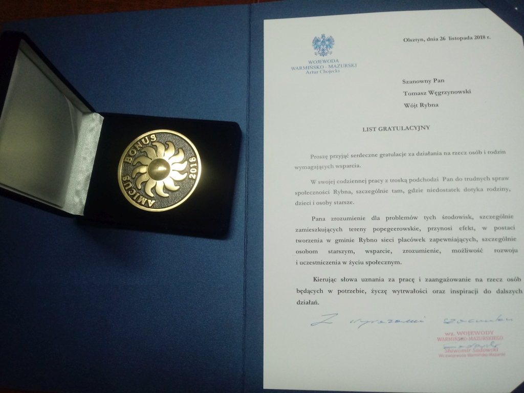 Nagroda ta ustanowiona została w roku 2007 przez ówczesnego wojewodę warmińsko – mazurskiego, Panią Annę Szyszkę. Każdego roku z okazji Dnia Pracownika Socjalnego, nagrody te przyznawane są osobom, które budują system wsparcia potrzebujących oraz angażują się w i pracę na ich rzecz. Wojewoda wyróżnił Wojta Gminy Rybno za działania na rzecz osób i rodzin wymagających wsparcia, w szczególności tworzenie w gminie Rybno sieci placówek zapewniających osobom starszym wsparcie oraz możliwość rozwoju i uczestniczenia w życiu społecznym.
