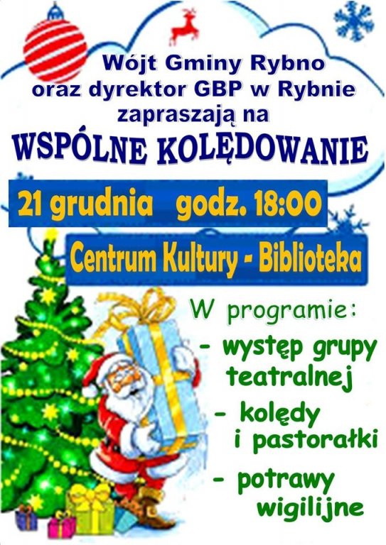 Zapraszamy na wspólne kolędowanie w sobotę 21 grudnia o godz. 18:00 w Centrum Kultury – Bibliotece.