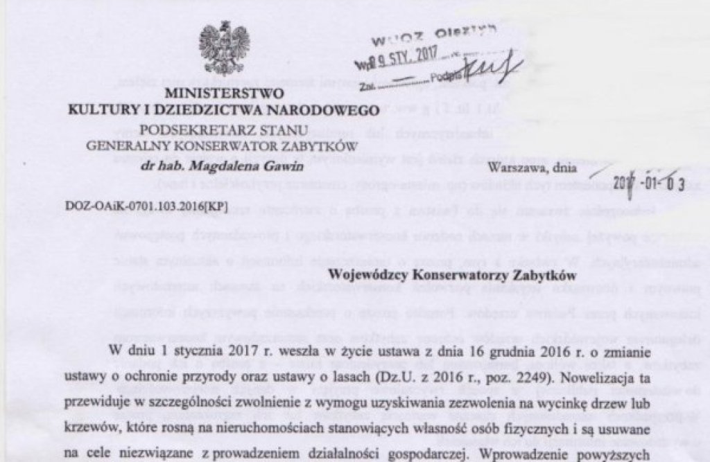 Przedstawiamy okólnik Generalnego Konserwatora Zabytków zawierający informacje na temat zasad udzielania pozwoleń na wycinkę drzew na terenach wpisanych do rejestru zabytków.
