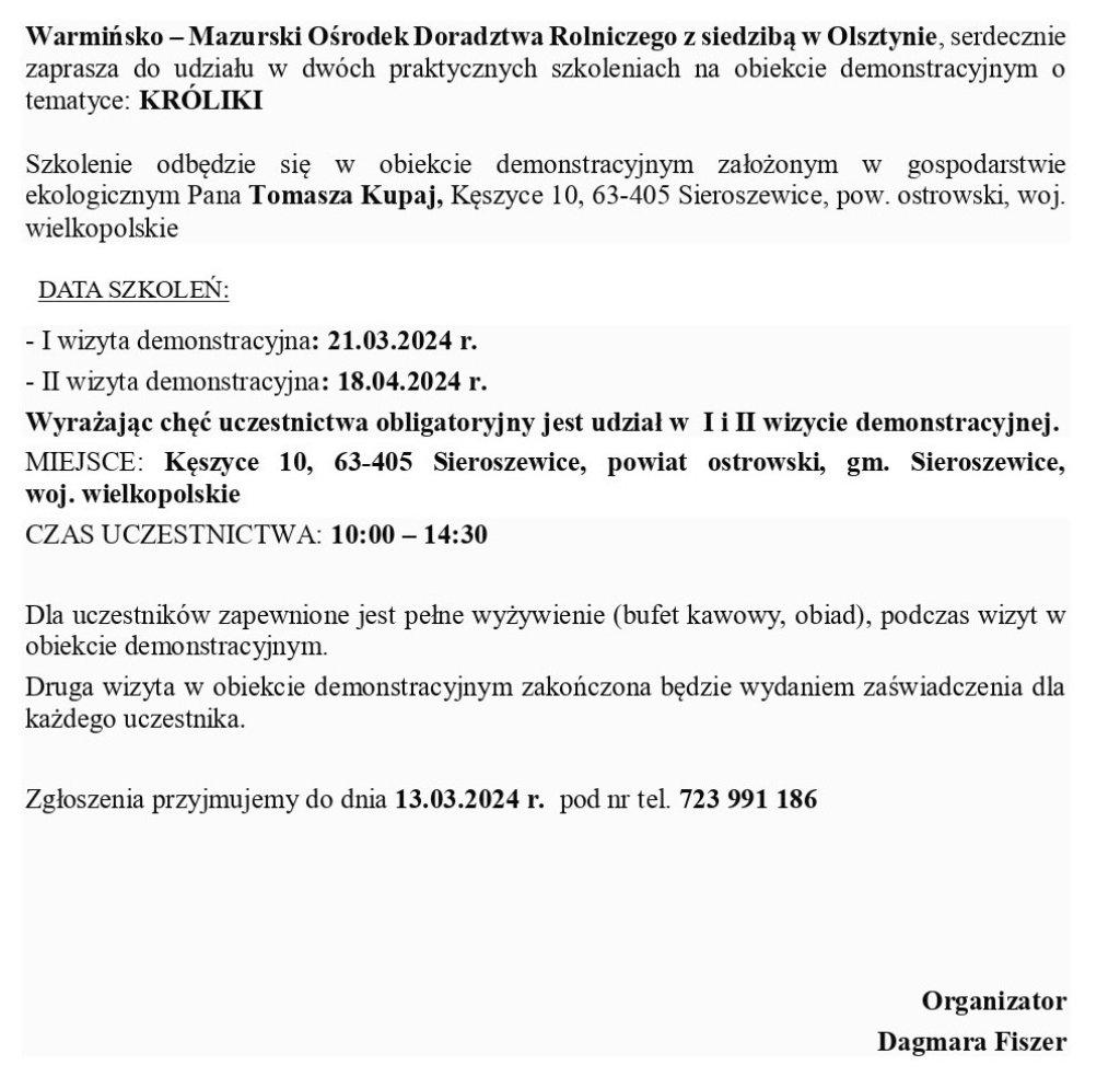 Warmińsko — Mazurski Ośrodek Doradztwa Rolniczego z siedzibą w Olsztynie, serdecznie zaprasza do udziału w dwóch praktycznych szkoleniach na obiekcie demonstracyjnym o tematyce: KRÓLIKI.