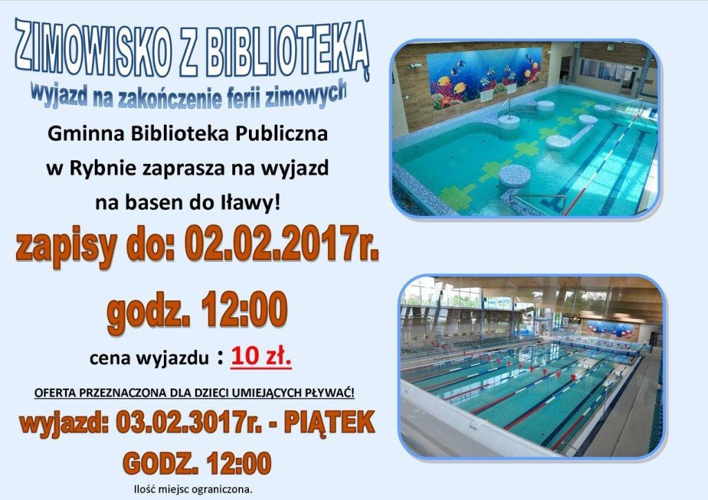 Gminna Biblioteka Publiczna w Rybnie organizuje wyjazd na basen do Iławy. Osoby zainteresowane mogą się zgłaszać w terminie do dnia 2 lutego 2017r. do godz. 12:00