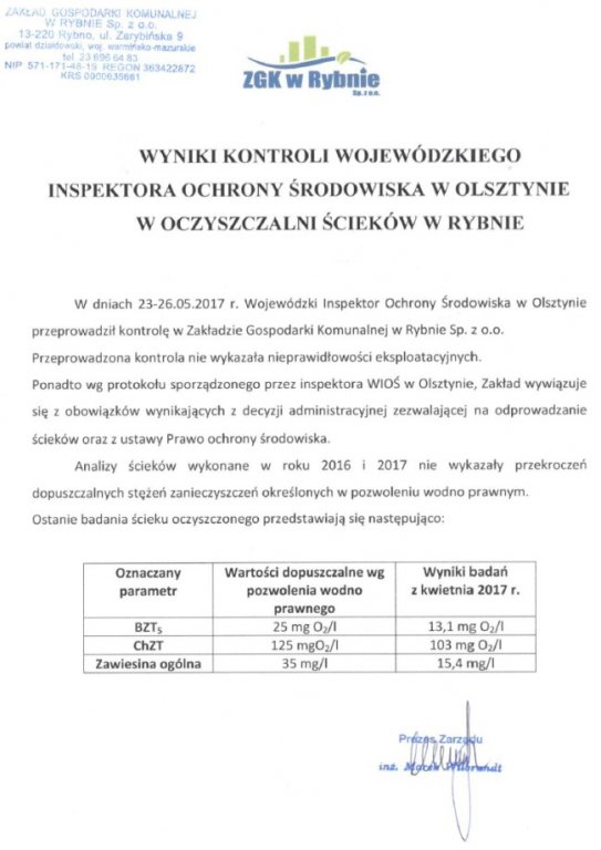W dniach 23-26.05.2017 r. Wojewódzki Inspektor Ochrony Środowiska w Olsztynie przeprowadził kontrolę w Zakładzie Gospodarki Komunalnej w Rybnie Sp. z o.o. Przeprowadzona kontrola nie wykazała nieprawidłowości eksploatacyjnych.