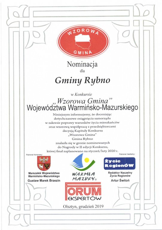 Gmina Rybno ma przyjemność poinformować, że po dokładnym przeanalizowaniu i zapoznaniu się z przygotowanym materiałem opisującym Gminę Wiejską Rybno, Forum Ekspertów wydało jednoznaczną decyzję, o przyznaniu dla Gminy Wiejskiej Rybno tytułu "Wzorowa Gmina" na najbliższe 3 lata, czyli do końca 2023 roku.