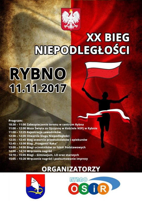 Zapraszamy do udziału w XX Biegu Niepodległości, który odbędzie się 11 listopada 2017r. w Rybnie.