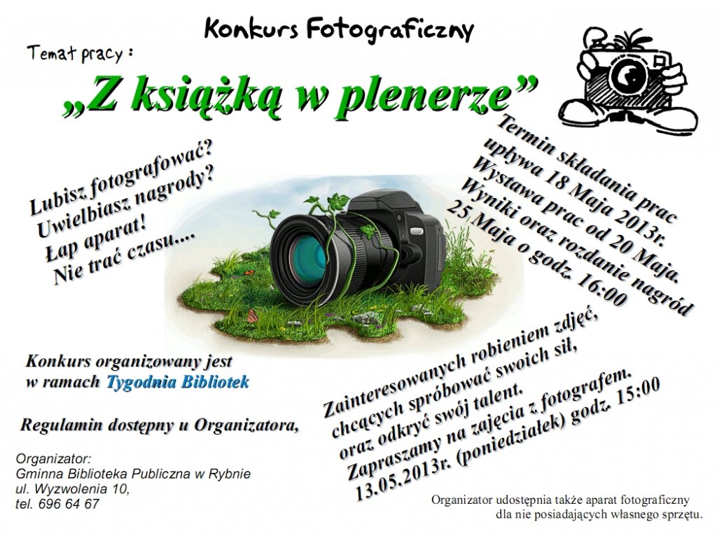 Organizowany w ramach "Tygodnia Bibliotek" konkurs ma charakter otwarty i skierowany jest do wszystkich mieszkańców Gminy Rybno, a jego celem jest rozpowszechnianie i popularyzacja fotografii jako dziedziny sztuki.