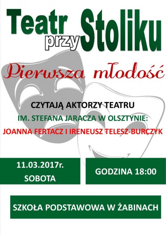 W sobotę, 11 marca 2017r. w Szkole Podstawowej w Żabinach gościć będą aktorzy teatru im. Stefana Jaracza z Olsztyna.