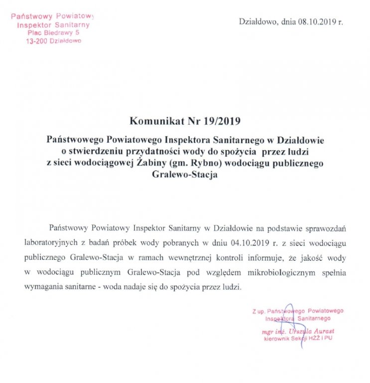 Komunikat Nr 19/2019 Państwowego Powiatowego Inspektora Sanitarnego w Działdowie o stwierdzeniu przydatności wody do spożycia przez ludzi z sieci wodociągowej Żabiny (gm. Rybno) wodociągu publicznego Gralewo-Stacja.