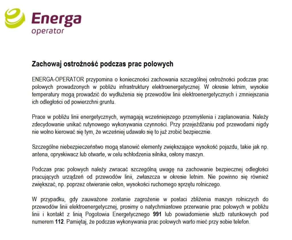 W przypadku, gdy zauważone zostanie zagrożenie w postaci zbliżenia maszyn rolniczych do przewodów linii elektroenergetycznej, prosimy o natychmiastowe przerwanie prac polowych w pobliżu linii i kontakt z linią Pogotowia Energetycznego 991 lub powiadomienie służb ratunkowych pod numerem 112. Pamiętaj, że podczas wykonywania prac polowych warto mieć przy sobie telefon.